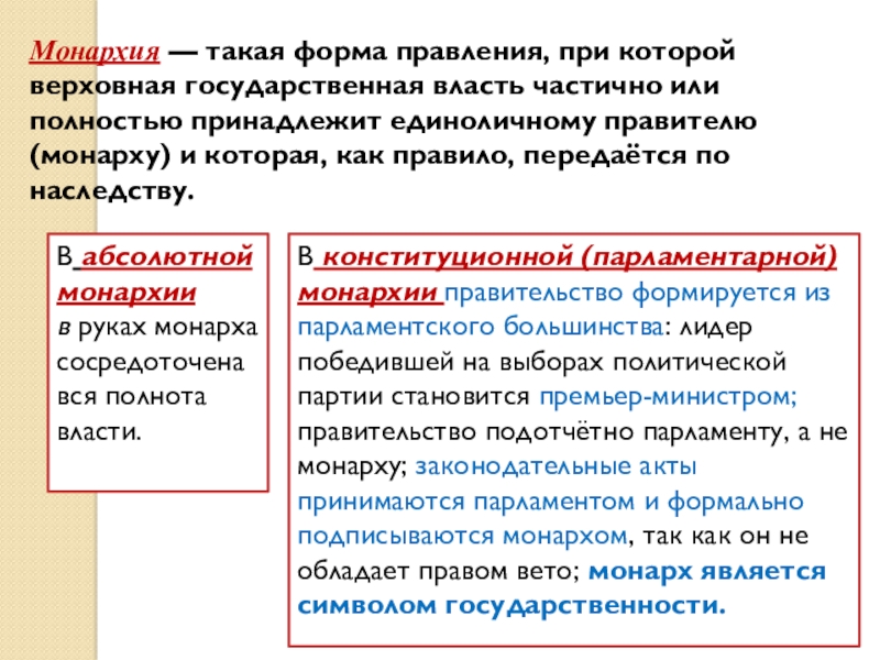 В конституционной (парламентарной) монархии правительство формируется из парламентского большинства: лидер победившей на выборах политической партии становится премьер-министром; правительство подотчётно парламенту, а не монарху; законодательные акты принимаются парламентом и формально подписываются монархом, так как он не обладает правом вето; монарх является символом государственности.