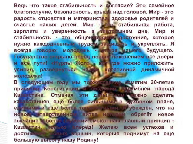 над головой. Мир - это радость отцовства и материнства, здоровье родителей и счастье наших детей. Мир - это стабильная работа, зарплата и уверенность в завтрашнем дне. Мир и стабильность - это общенародное достояние, которое нужно каждодневным трудом защищать и укреплять. Я всегда говорю: молодежь - опора нашего будущего. Государство открыло перед новым поколением все двери и все пути! «Нұрлы Жол» - вот где можно приложить усилия, развернуться нашей креативной динамичной молодежи!