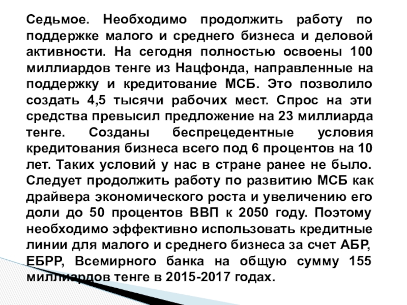 деловой активности. На сегодня полностью освоены 100 миллиардов тенге из Нацфонда, направленные на поддержку и кредитование МСБ. Это позволило создать 4,5 тысячи рабочих мест. Спрос на эти средства превысил предложение на 23 миллиарда тенге. Созданы беспрецедентные условия кредитования бизнеса всего под 6 процентов на 10 лет. Таких условий у нас в стране ранее не было. Следует продолжить работу по развитию МСБ как драйвера экономического роста и увеличению его доли до 50 процентов ВВП к 2050 году. Поэтому необходимо эффективно использовать кредитные линии для малого и среднего бизнеса за счет АБР, ЕБРР, Всемирного банка на общую сумму 155 миллиардов тенге в 2015-2017 годах.
