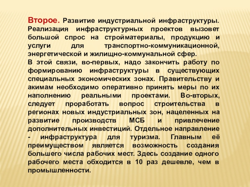 Слайд 8Второе. Развитие индустриальной инфраструктуры. Реализация инфраструктурных проектов вызовет большой спрос на