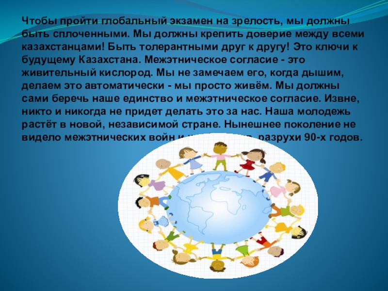 должны крепить доверие между всеми казахстанцами! Быть толерантными друг к другу! Это ключи к будущему Казахстана. Межэтническое согласие - это живительный кислород. Мы не замечаем его, когда дышим, делаем это автоматически - мы просто живём. Мы должны сами беречь наше единство и межэтническое согласие. Извне, никто и никогда не придет делать это за нас. Наша молодежь растёт в новой, независимой стране. Нынешнее поколение не видело межэтнических войн и конфликтов, разрухи 90-х годов.