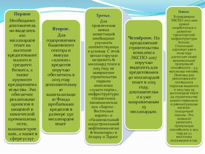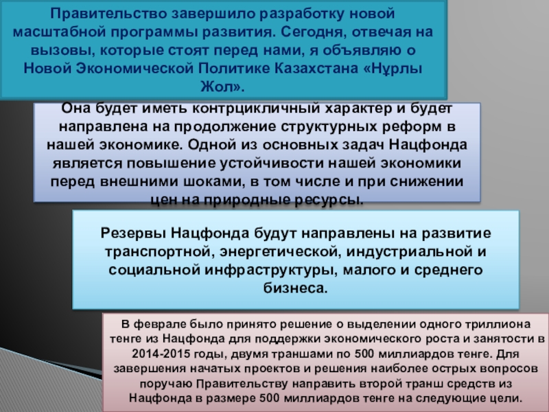 В феврале было принято решение о выделении одного триллиона тенге из Нацфонда для поддержки экономического роста и занятости в 2014-2015 годы, двумя траншами по 500 миллиардов тенге. Для завершения начатых проектов и решения наиболее острых вопросов поручаю Правительству направить второй транш средств из Нацфонда в размере 500 миллиардов тенге на следующие цели.