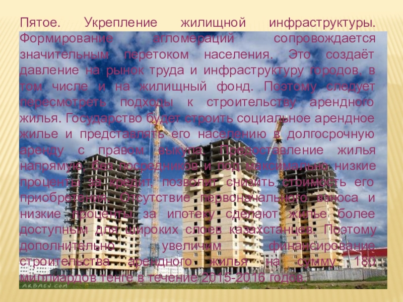 создаёт давление на рынок труда и инфраструктуру городов, в том числе и на жилищный фонд. Поэтому следует пересмотреть подходы к строительству арендного жилья. Государство будет строить социальное арендное жилье и представлять его населению в долгосрочную аренду с правом выкупа. Предоставление жилья напрямую, без посредников и под максимально низкие проценты за кредит, позволит снизить стоимость его приобретения. Отсутствие первоначального взноса и низкие проценты за ипотеку сделают жилье более доступным для широких слоев казахстанцев. Поэтому дополнительно увеличим финансирование строительства арендного жилья на сумму 180 миллиардов тенге в течение 2015-2016 годов.