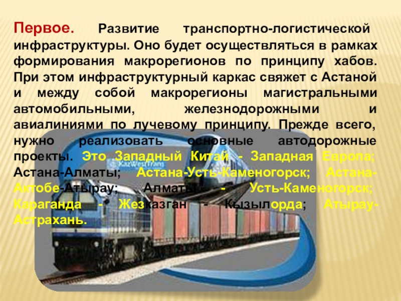 Слайд 7Первое. Развитие транспортно-логистической инфраструктуры. Оно будет осуществляться в рамках формирования макрорегионов