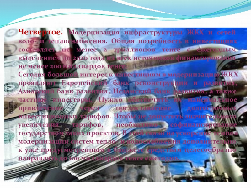 Сегодня большой интерес к инвестициям в модернизацию ЖКХ проявляют Европейский банк реконструкции и развития, Азиатский банк развития, Исламский банк развития, а также частные инвесторы. Нужно обеспечить их максимальное привлечение через предоставление долгосрочных инвестиционных тарифов. Чтобы не допустить значительного увеличения тарифов, необходимо софинансирование государством таких проектов. В этой связи на ускорение темпов модернизации систем тепло- и водоснабжения дополнительно к уже предусмотренным в бюджете средствам целесообразно направлять до 100 миллиардов тенге ежегодно.