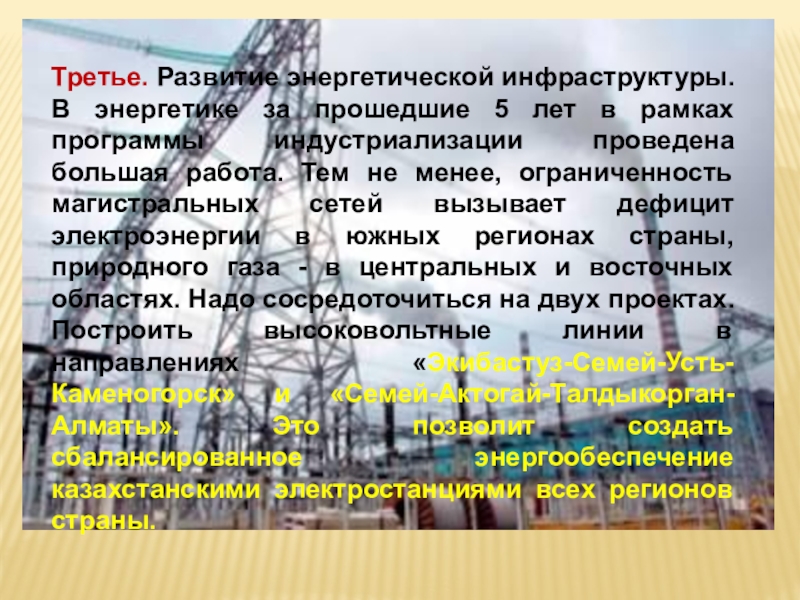рамках программы индустриализации проведена большая работа. Тем не менее, ограниченность магистральных сетей вызывает дефицит электроэнергии в южных регионах страны, природного газа - в центральных и восточных областях. Надо сосредоточиться на двух проектах. Построить высоковольтные линии в направлениях «Экибастуз-Семей-Усть-Каменогорск» и «Семей-Актогай-Талдыкорган-Алматы». Это позволит создать сбалансированное энергообеспечение казахстанскими электростанциями всех регионов страны.
