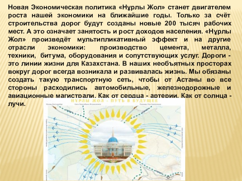 ближайшие годы. Только за счёт строительства дорог будут созданы новые 200 тысяч рабочих мест. А это означает занятость и рост доходов населения. «Нұрлы Жол» произведёт мультипликативный эффект и на другие отрасли экономики: производство цемента, металла, техники, битума, оборудования и сопутствующих услуг. Дороги - это линии жизни для Казахстана. В наших необъятных просторах вокруг дорог всегда возникала и развивалась жизнь. Мы обязаны создать такую транспортную сеть, чтобы от Астаны во все стороны расходились автомобильные, железнодорожные и авиационные магистрали. Как от сердца - артерии. Как от солнца - лучи.