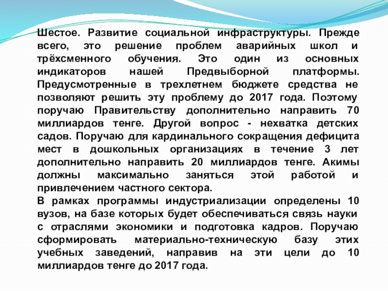 Слайд 12Шестое. Развитие социальной инфраструктуры. Прежде всего, это решение проблем аварийных школ
