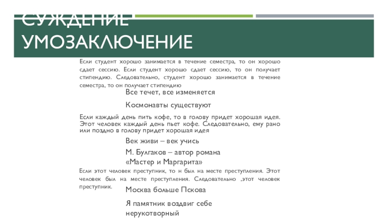 Если каждый день пить кофе, то в голову придет хорошая идея. Этот человек каждый день пьет кофе. Следовательно, ему рано или поздно в голову придет хорошая идея