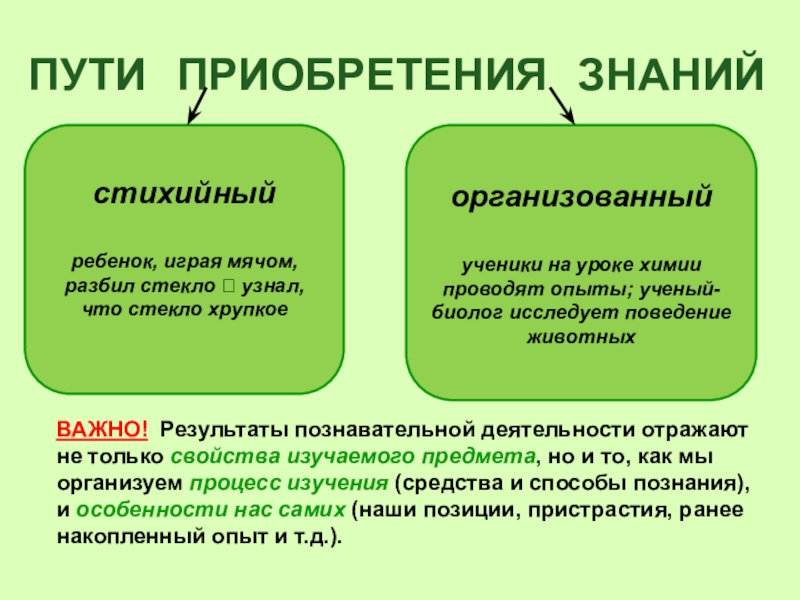 ВАЖНО! Результаты познавательной деятельности отражают не только свойства изучаемого предмета, но и то, как мы организуем процесс изучения (средства и способы познания), и особенности нас самих (наши позиции, пристрастия, ранее накопленный опыт и т.д.).
