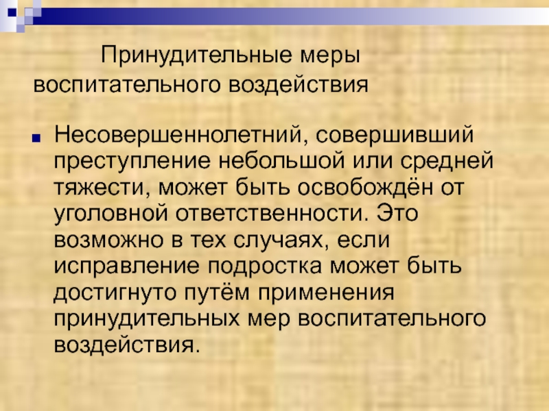 Несовершеннолетний, совершивший преступление небольшой или средней тяжести, может быть освобождён от уголовной ответственности. Это возможно в тех случаях, если исправление подростка может быть достигнуто путём применения принудительных мер воспитательного воздействия.