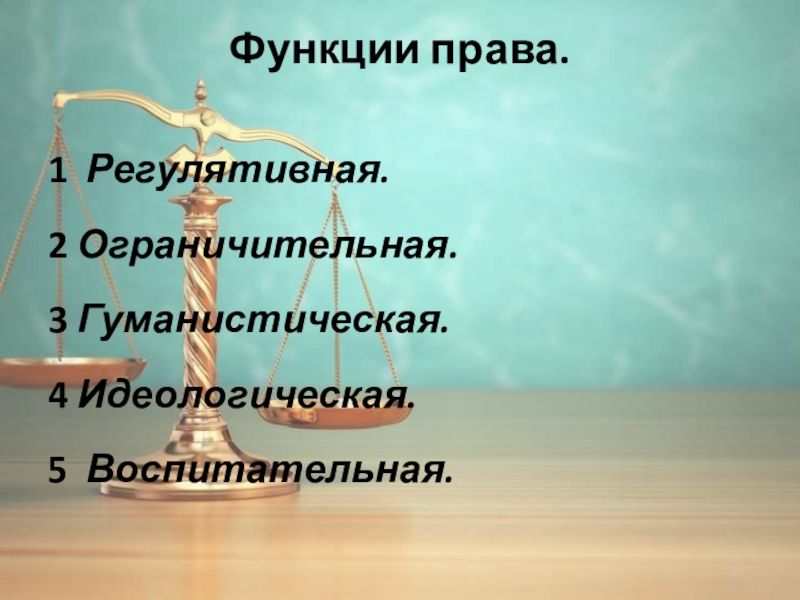 Функции права. 1 Регулятивная. 2 Ограничительная. 3 Гуманистическая. 4 Идеологическая. 5 Воспитательная.