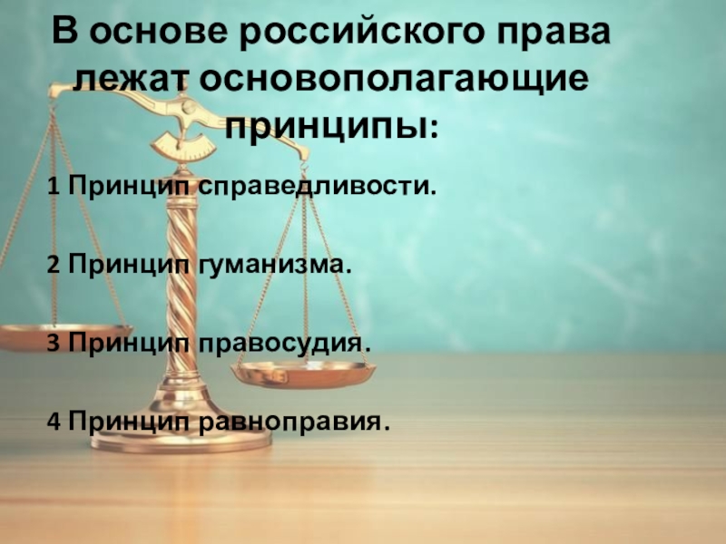 В основе российского права лежат основополагающие принципы: 1 Принцип справедливости.	2 Принцип гуманизма.	3 Принцип правосудия.	4 Принцип равноправия.