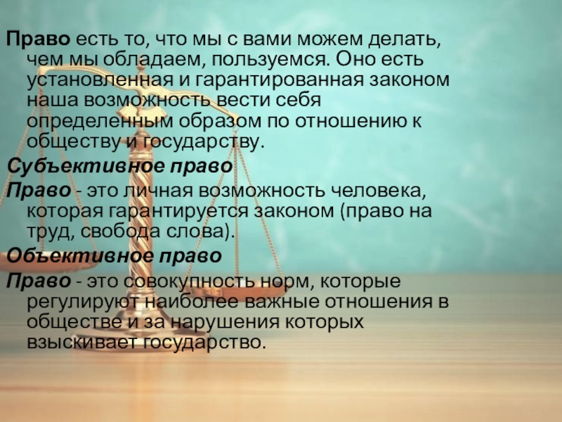 Право есть то, что мы с вами можем делать, чем мы обладаем, пользуемся. Оно есть установленная и