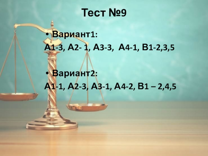 Тест №9 Вариант1: А1-3, А2- 1, А3-3, А4-1, В1-2,3,5Вариант2:А1-1, А2-3, А3-1, А4-2, В1 – 2,4,5
