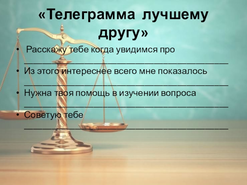 «Телеграмма лучшему другу» Расскажу тебе когда увидимся про ____________________________________________Из этого интереснее всего мне показалось ____________________________________________Нужна твоя помощь