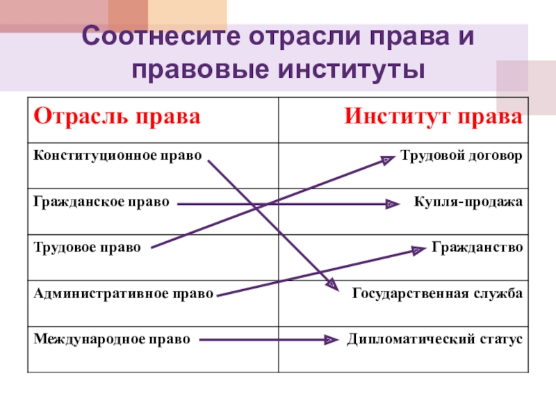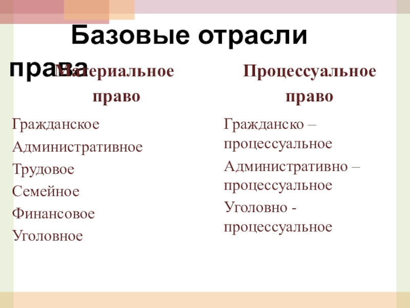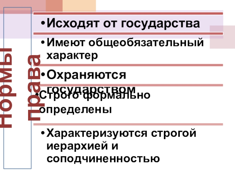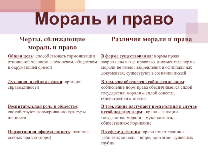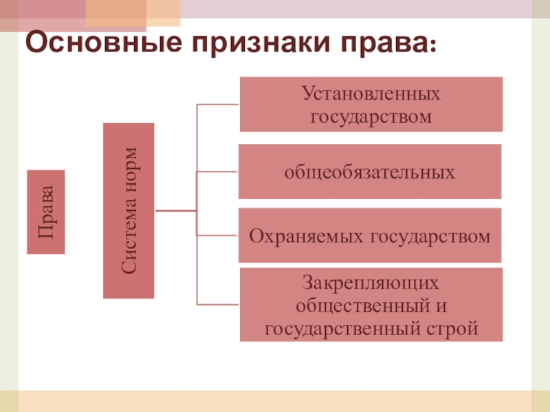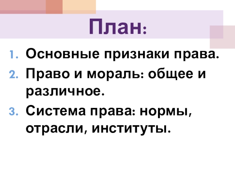 План:Основные признаки права.Право и мораль: общее и различное.Система права: нормы, отрасли, институты.