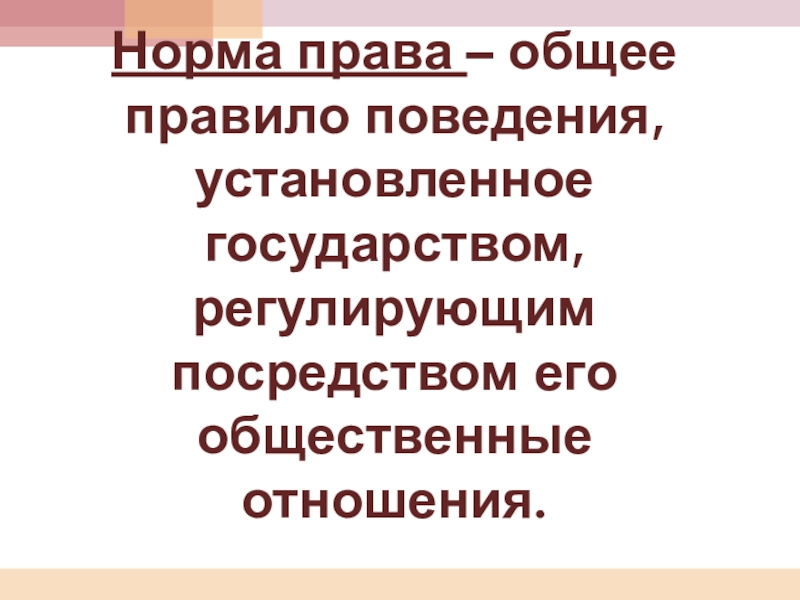 Слайд 8Норма права – общее правило поведения, установленное государством, регулирующим посредством его
