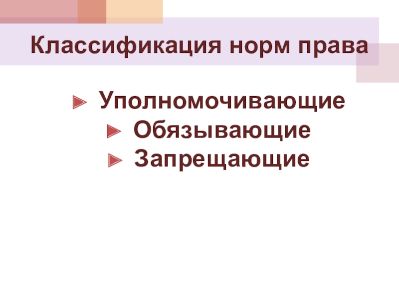 Классификация норм права Уполномочивающие Обязывающие Запрещающие
