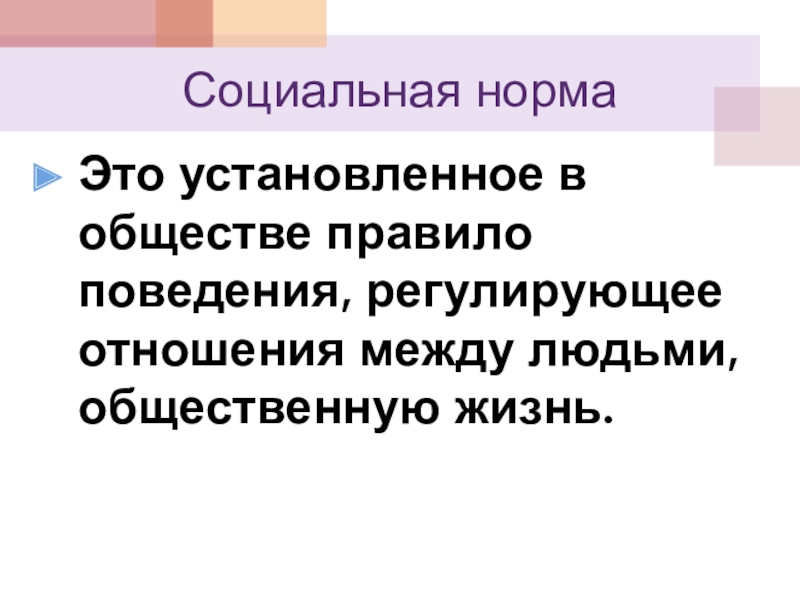 Социальная нормаЭто установленное в обществе правило поведения, регулирующее отношения между людьми, общественную жизнь.
