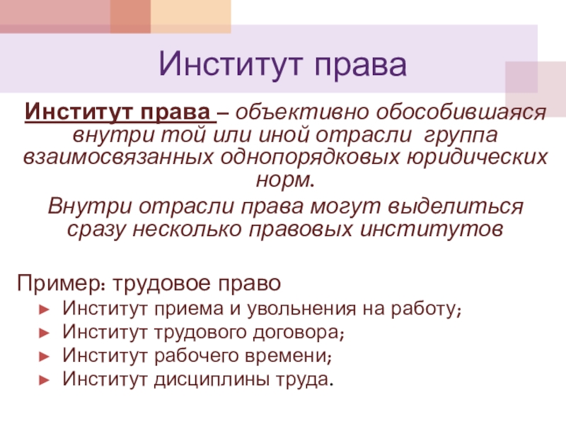 Институт праваИнститут права – объективно обособившаяся внутри той или иной отрасли группа взаимосвязанных однопорядковых юридических норм.Внутри отрасли