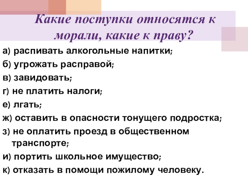 Какие поступки относятся к морали, какие к праву? а) распивать алкогольные напитки;б) угрожать расправой;в) завидовать;г)