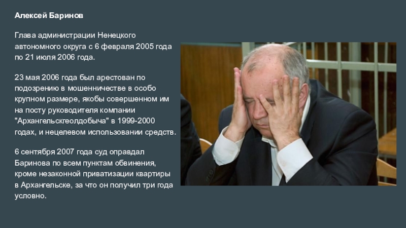 6 сентября 2007 года суд оправдал Баринова по всем пунктам обвинения, кроме незаконной приватизации квартиры в Архангельске, за что он получил три года условно.