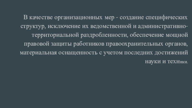Слайд 24В качестве организационных мер - создание специфических структур, исключение их ведомственной