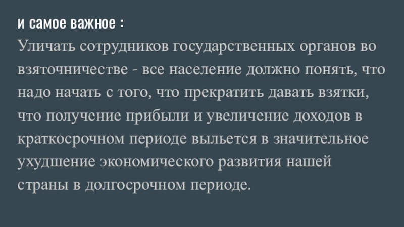 все население должно понять, что надо начать с того, что прекратить давать взятки, что получение прибыли и увеличение доходов в краткосрочном периоде выльется в значительное ухудшение экономического развития нашей страны в долгосрочном периоде.