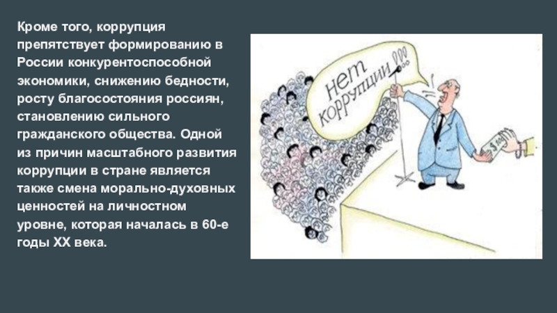 Слайд 6Кроме того, коррупция препятствует формированию в России конкурентоспособной экономики, снижению бедности,