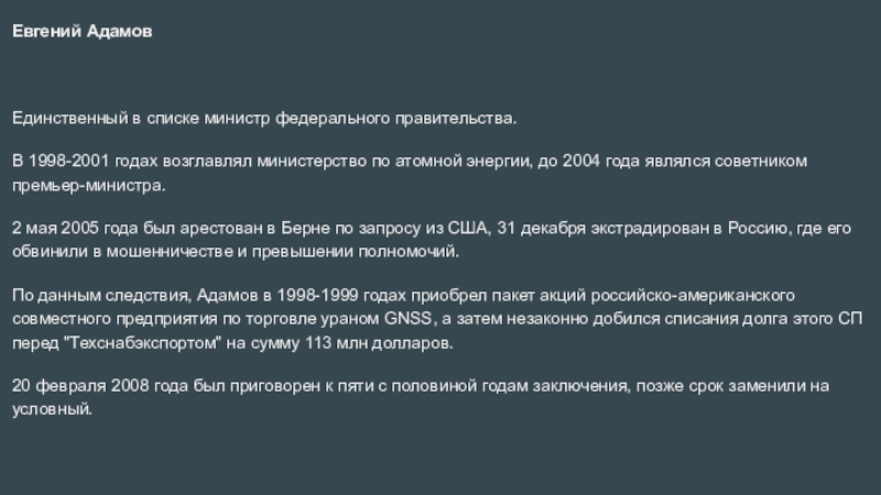 По данным следствия, Адамов в 1998-1999 годах приобрел пакет акций российско-американского совместного предприятия по торговле ураном GNSS, а затем незаконно добился списания долга этого СП перед "Техснабэкспортом" на сумму 113 млн долларов.