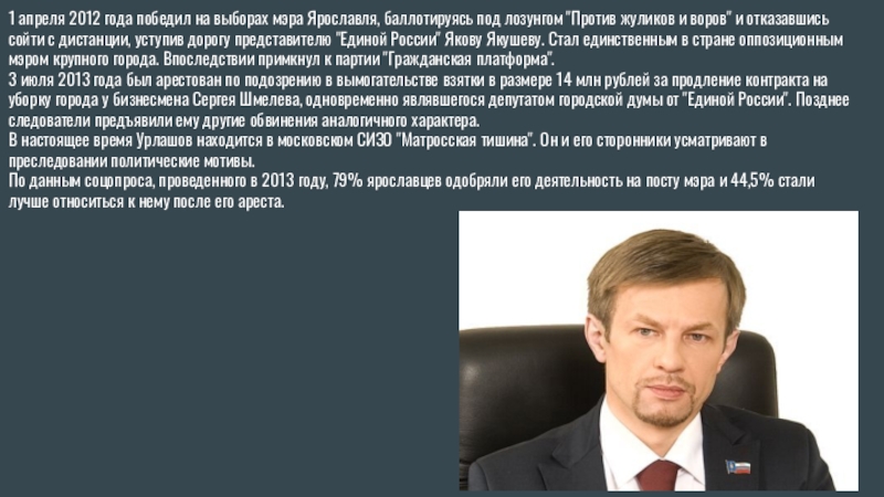 Слайд 161 апреля 2012 года победил на выборах мэра Ярославля, баллотируясь под