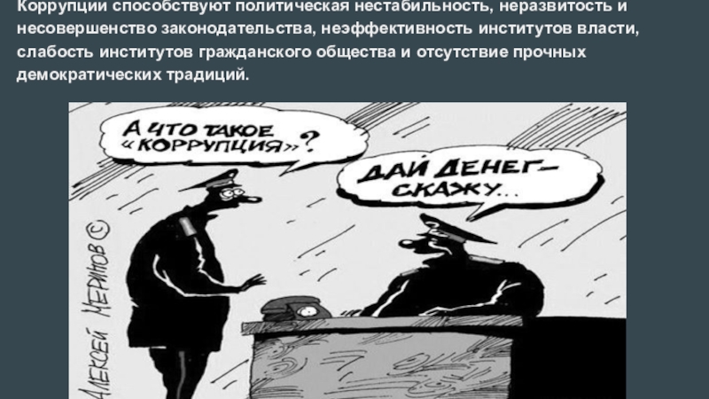 Слайд 8Коррупции способствуют политическая нестабильность, неразвитость и несовершенство законодательства, неэффективность институтов власти,