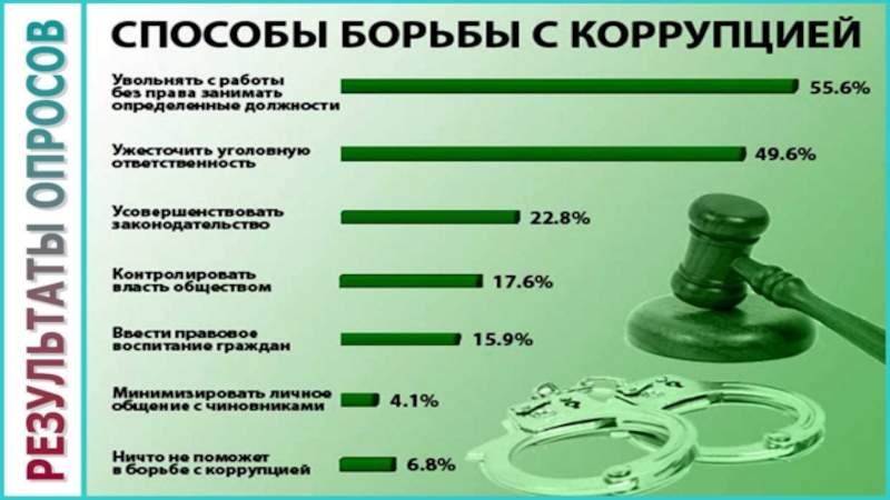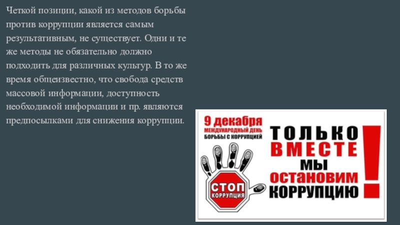 Слайд 22Четкой позиции, какой из методов борьбы против коррупции является самым результативным,