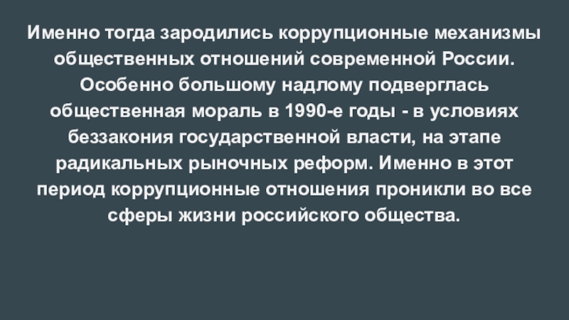 надлому подверглась общественная мораль в 1990-е годы - в условиях беззакония государственной власти, на этапе радикальных рыночных реформ. Именно в этот период коррупционные отношения проникли во все сферы жизни российского общества.
