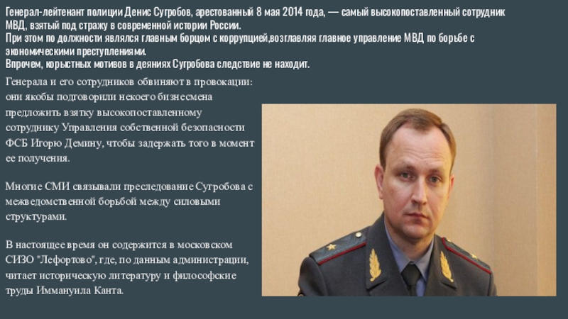 Слайд 17Генерал-лейтенант полиции Денис Сугробов, арестованный 8 мая 2014 года, — самый