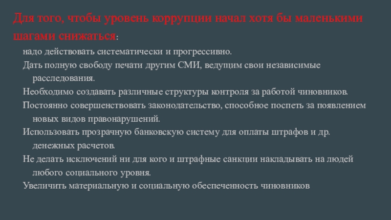 Слайд 26Для того, чтобы уровень коррупции начал хотя бы маленькими шагами снижаться: