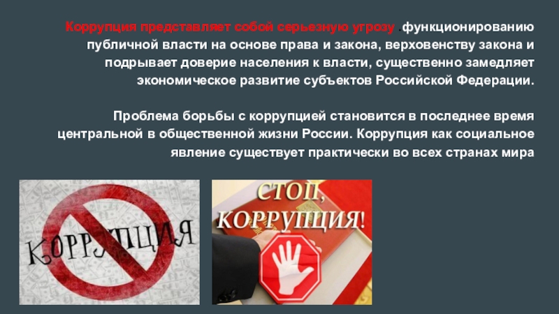 Слайд 2Коррупция представляет собой серьезную угрозу .функционированию публичной власти на основе права
