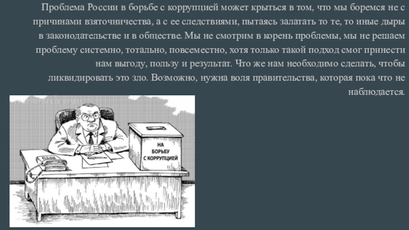 Слайд 23Проблема России в борьбе с коррупцией может крыться в том, что