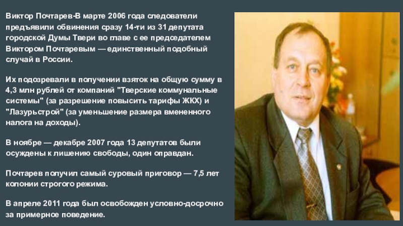 Слайд 12Виктор Почтарев-В марте 2006 года следователи предъявили обвинения сразу 14-ти из