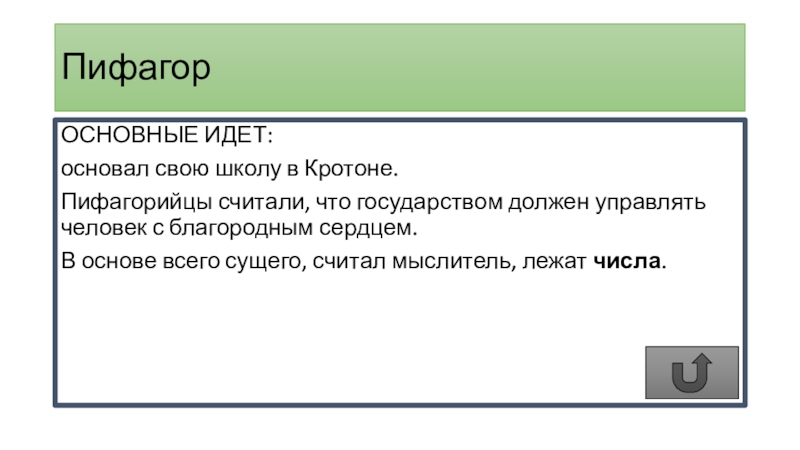 Знания мыслитель рассматривает как общий фундамент для саморазвития личности. “ПОЗНАЙ САМОГО СЕБЯ” – вот основной тезис философа. В 399 году до н. э. Сократа обвинили в богохульстве и растлении молодёжи. Ему был вынесен смертный приговор. Как свободный гражданин Эллады, Сократ был должен принять яд, что он и сделал.