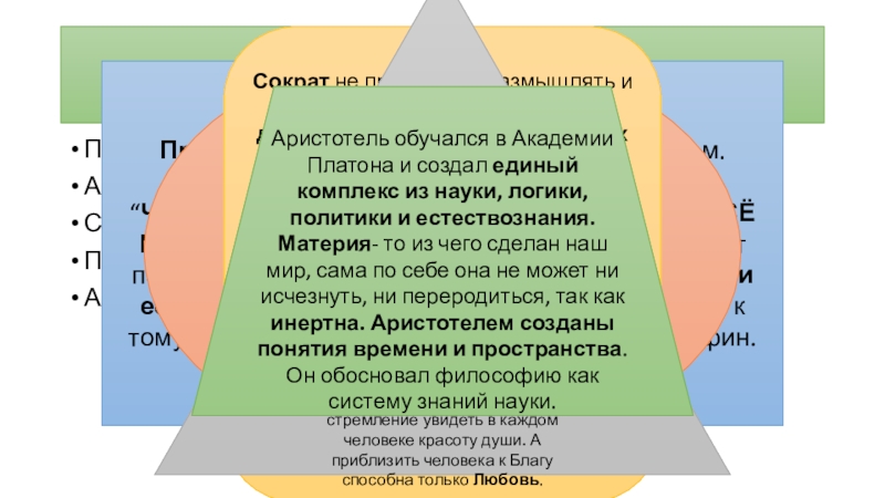 философия Платона вобрала в себя основные тезисы Сократа и Пифагора. Мыслитель стал основоположником теории идеализма. Высшее нечто, согласно его теории, есть Благо. Человеческие желания непостоянны и напоминают колесницу запряженную двумя конями. Познание мира – это стремление увидеть в каждом человеке красоту души. А приблизить человека к Благу способна только Любовь.