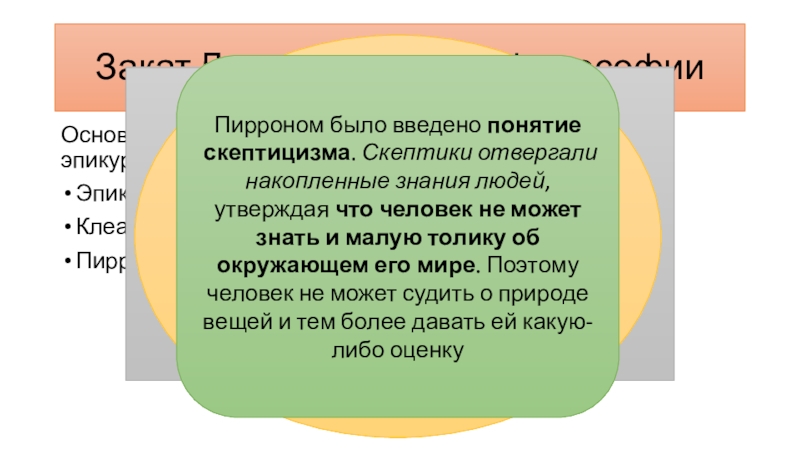 Пирроном было введено понятие скептицизма. Скептики отвергали накопленные знания людей, утверждая что человек не может знать и малую толику об окружающем его мире. Поэтому человек не может судить о природе вещей и тем более давать ей какую-либо оценку