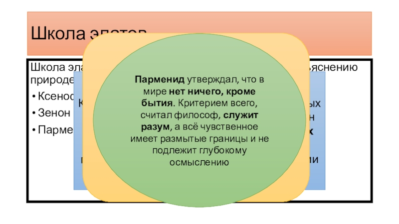 Приёмный сын Парменида Зенон разработал теорию “мира мнения”, в которой главная роль принадлежит движению и числу. Этот мыслитель пытается отсечь всё непонятное методом исключения