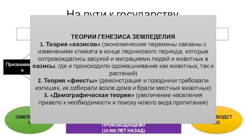 1. Теория «оазисов» (экономические перемены связаны с изменением климата в конце ледникового периода, которые сопровождались засухой и миграциями людей и животных в оазисы, где и происходило одомашнивание как животных, так и растений)