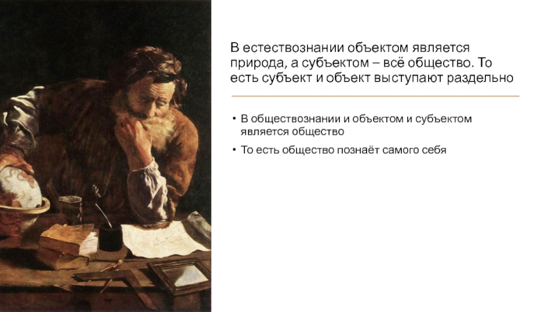Объект и субъект совпадают. Действительно, изучая общество, закономерности его развития, учёный одновременно сам является частью этого общества.