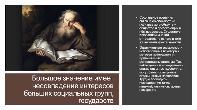 Зависимость исследователя от общества. Это может привести к необъективности тех или иных выводов. Достаточно привести в пример деятельность Сталина. Разве могли в его время критиковать политику вождя? Всё приукрашивалось и многое искажалось.