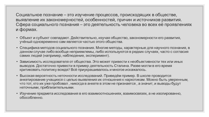 Специфика методов социального познания. Многие методы, характерные для научного познания, в данном случае либо вообще неприемлемы, либо используются в редких случаях, часто с согласия самих людей (например, наблюдение, эксперимент).