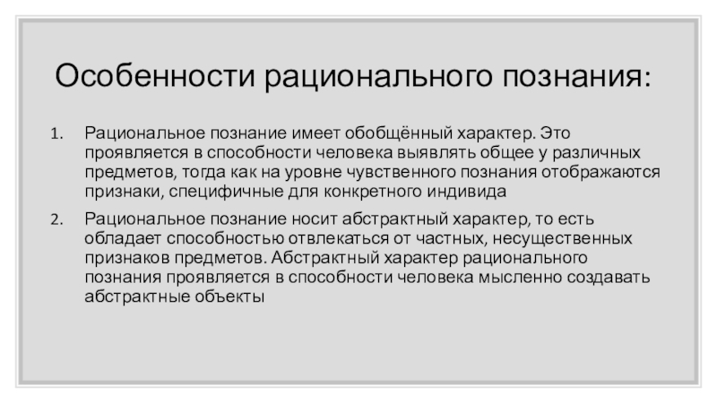 Рациональное познание носит абстрактный характер, то есть обладает способностью отвлекаться от частных, несущественных признаков предметов. Абстрактный характер рационального познания проявляется в способности человека мысленно создавать абстрактные объекты