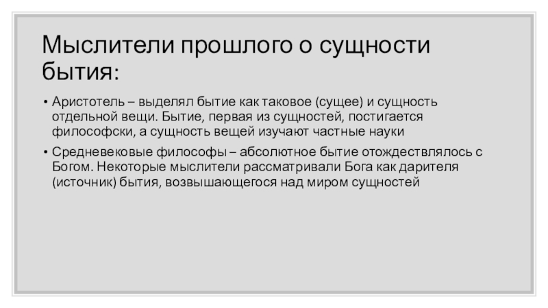 Средневековые философы – абсолютное бытие отождествлялось с Богом. Некоторые мыслители рассматривали Бога как дарителя (источник) бытия, возвышающегося над миром сущностей